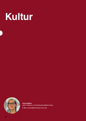 Kultur Ursel Hebben stellv. Direktorin und Fachbereichsleiterin Kultur E-Mail: ursel.hebben@stadt.neuss.de 46