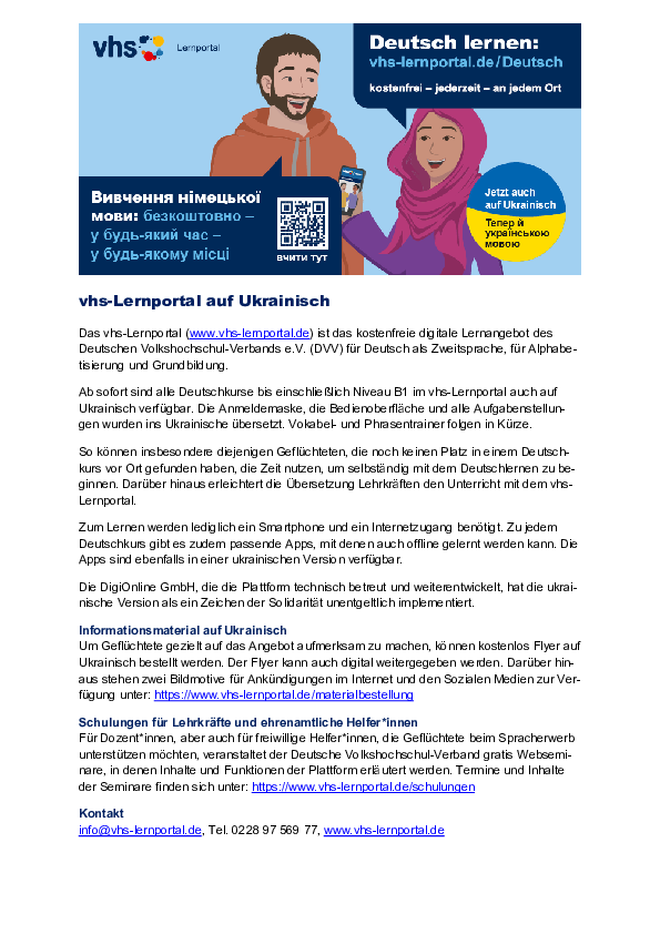 Das vhs-Lernportal ist das kostenfreie digitale Lernangebot des Deutschen Volkshochschul-Verbands e.V. (DVV) für Deutsch als Zweitsprache, für Alphabetisierung und Grundbildung. Ab sofort sind alle Deutschkurse bis einschließlich Niveau B1 im vhs-Lernportal auch auf Ukrainisch verfügbar.